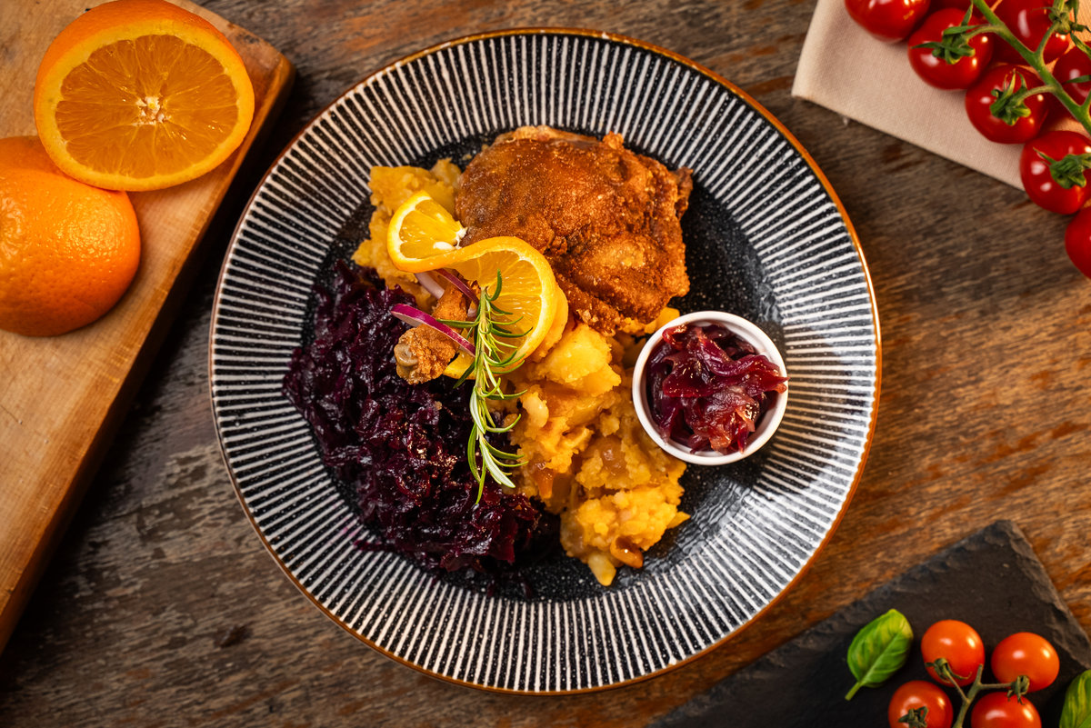 Sült kacsacomb hagymás tört burgonyával