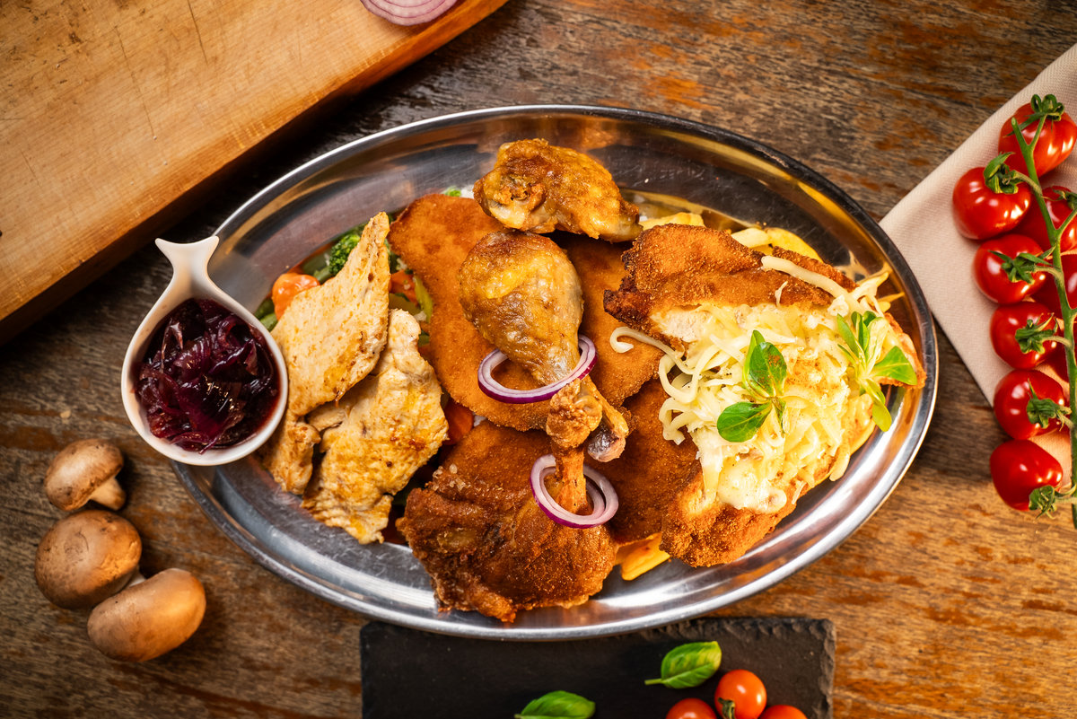4 személyre, tartalma: sült csirkecomb, sült kacsacomb, rántott csirkemell filé, roston csirkemell filé, sajttal töltött csirkemell filé rántva, párolt rizs, csónakburgonya, párolt zöldköret, mézes hagymalekvár